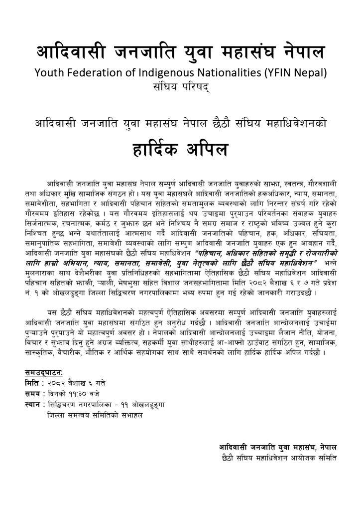 आदिवासी जनजाति युवा महासंघ नेपाल छैठौ संघिय महाधिवेशनको हार्दिक अपिल