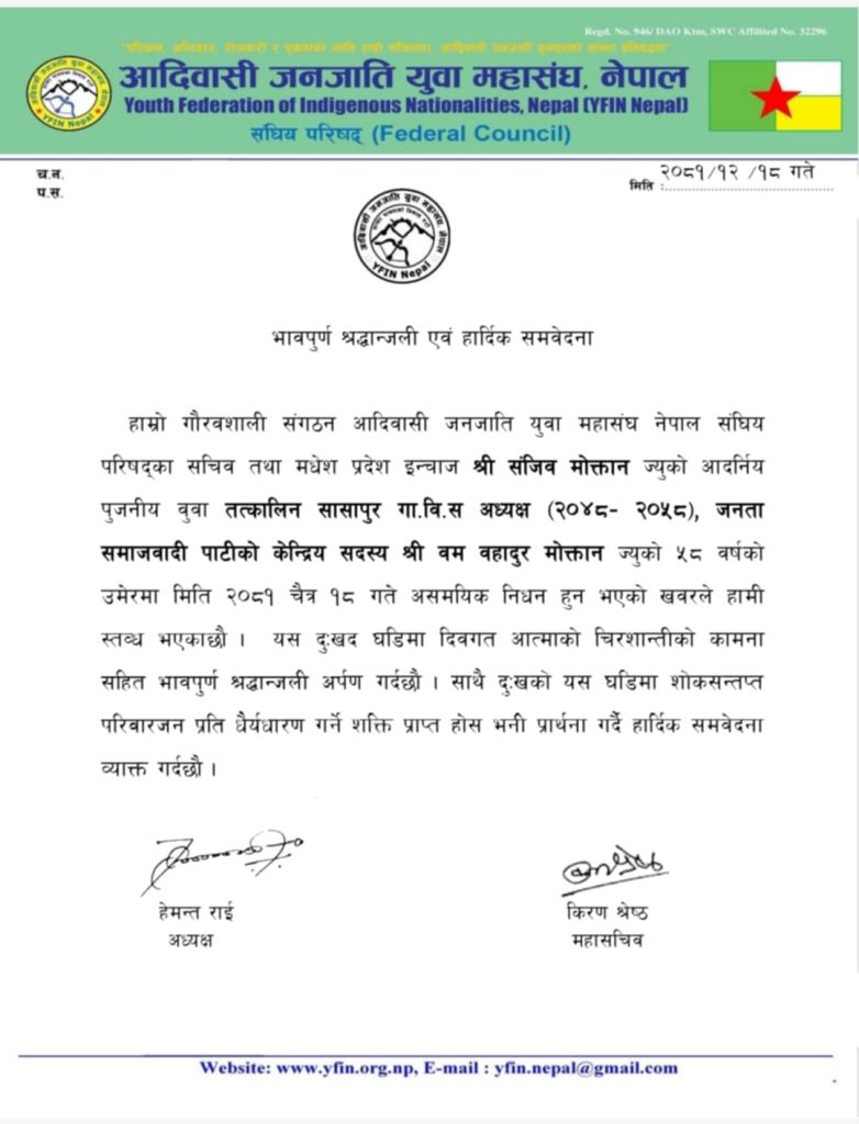 हाम्रो गौरवशाली संगठन आदिवासी जनजाति युवा महासंघ नेपाल संघिय परिषद्का सचिव तथा मधेश प्रदेश इन्चाज श्री संजिव मोक्तान ज्युको आदर्निय पुजनीय वुवा तत्कालिन सासापुर गा.वि.स अध्यक्ष (२०४८– २०५८), जनता समाजवादी पाटीको केन्द्रिय सदस्य श्री वम वहादुर मोक्तान ज्युको ५८ वर्षको उमेरमा मिति २०८१ चैत्र १८ गते असमयिक निधन हुन भएको खवरले हामी स्तव्ध भएकाछौ । यस दुःखद घडिमा दिवगत आत्माको चिरशान्तीको कामना सहित भावपुर्ण श्रद्धान्जली अर्पण गर्दछौ । साथै दुःखको यस घडिमा शोकसन्तप्त परिवारजन प्रति धैर्यधारण गर्ने शक्ति प्राप्त होस भनी प्रार्थना गर्दै हार्दिक समवेदना व्यक्त गर्दछौ ।